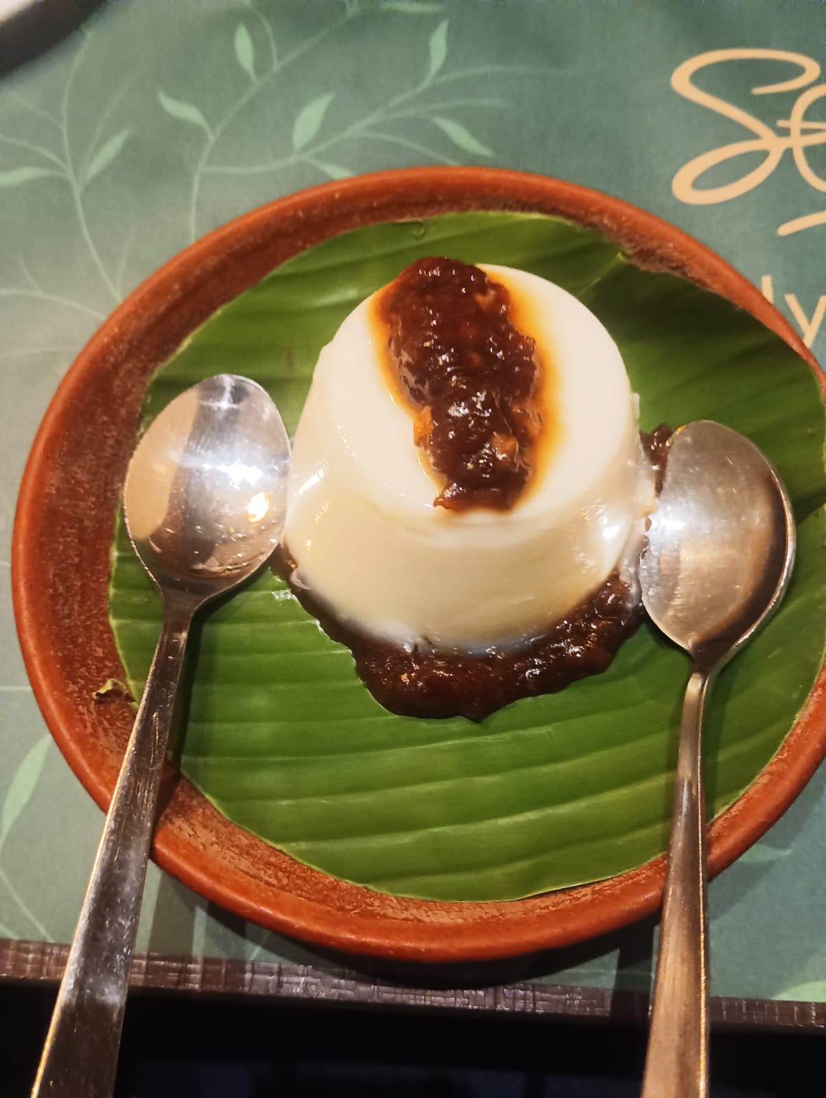 “Traditional tender coconut pudding topped with Panjamritham served on a banana leaf plate.”